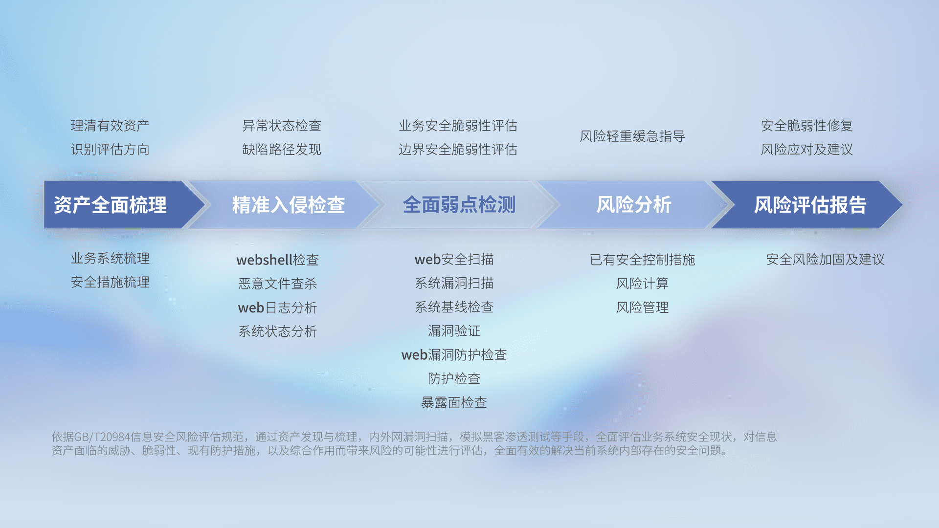 针对客户行业特性,,,以专业的安全服务+多厂商联合解决方案提供专属的一站式安全管理服务,,,,帮助客户全面感知网络空间威胁,,,基于识别、、、检测、、分析、、防护、、监测、、响应的服务理论模型,,,,从方案咨询、、、、集成交付、、、评估验证、、、、优化加固、、、、运维运营,,致力于为客户提供完整的闭环管理式安全服务。。。以实战经验为客户打造高抵御风险的安全体系,,,帮助客户发现威胁、、、对抗威胁、、、处置威胁,,,,不断积累安全对抗能力,,持续保障数字化安全。。